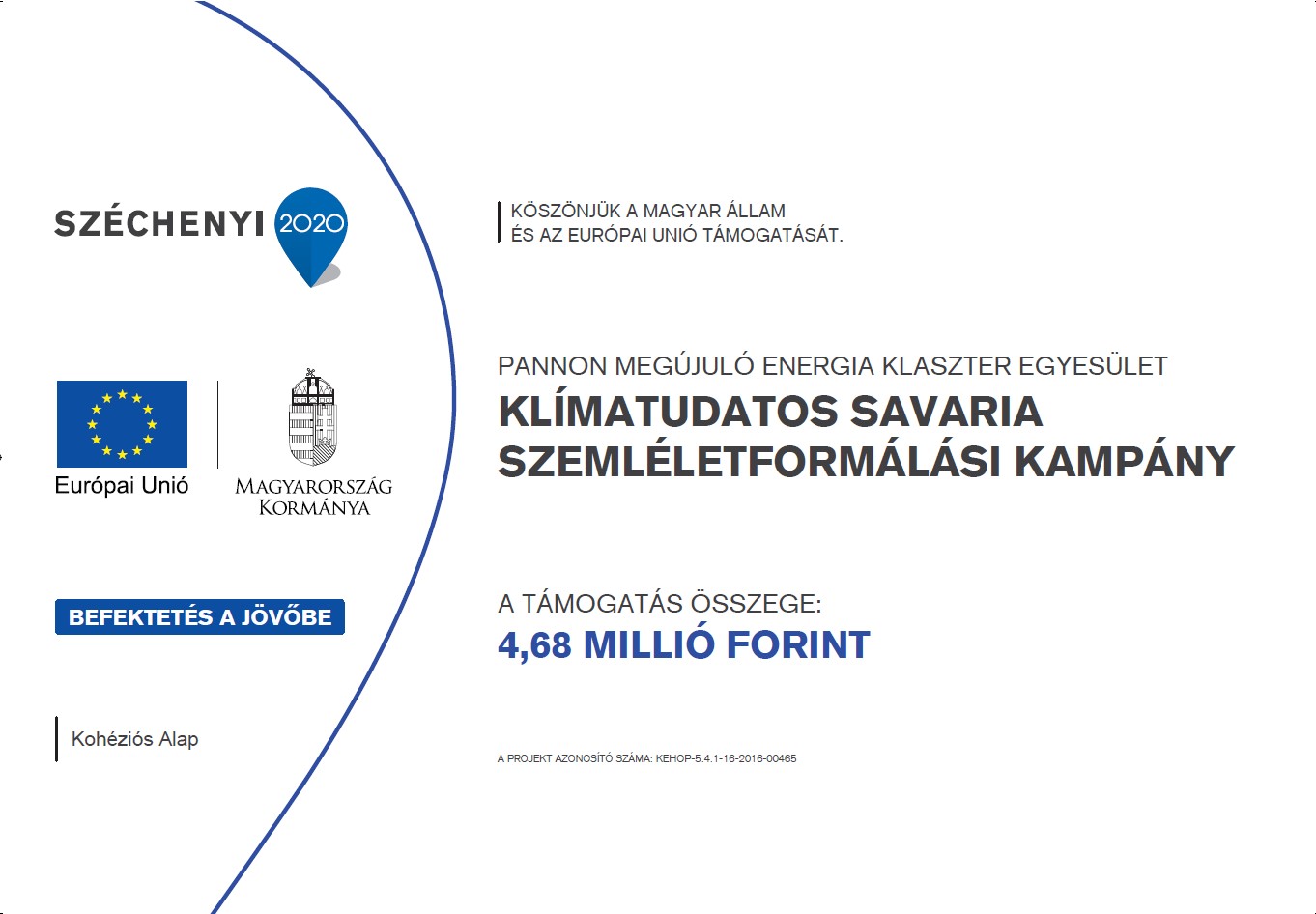 KEHOP 5-4-1-16-016-00465 - KLÍMATUDATOS SAVARIA SZEMLÉLETFORMÁLÁSI KAMPÁNY Projekt részletes szakmai tartalma: Átfogó cél egy városban (Savaria - Szombathely) és egy kistelepülésen (Csehimindszent) az ott lakók és dolgozók klíma- és energiatudatossága fokozása. Specifikus célok voltak: 500 polgár takarékos energiafelhasználásához szükséges ismeretek átadása, a takarékosság módjainak megismertetése a családi házaknál, az otthonok berendezéseinél és a közlekedés során. A célcsoportok a gyerekek, a szüleik, továbbá a projektben érintett intézmények dolgozói magánszemélyként. A megvalósulás a COVID helyzet miatt kissé eltért a még 2016-ban megfogalmazott és 2019-ben támogatási szerződésben részesített céloktól, de az eredeti számokat így is jelentősen sikerült meghaladni. - „Eléred? Kapcsold le!:) Megérted? Csináld okosan! Gyerekeknek és fiataloknak interaktív foglalkozássorozat megszervezése.” megnevezésű program során az aktív eléréseket 111 db aktív kampánytermék támasztotta alá. Ez az óvodások által készített rajzokat, és egyéb alkotásokat tartalmazza.
