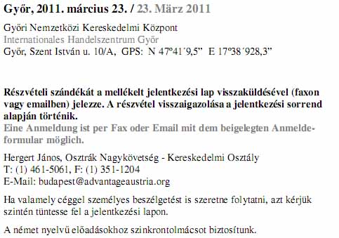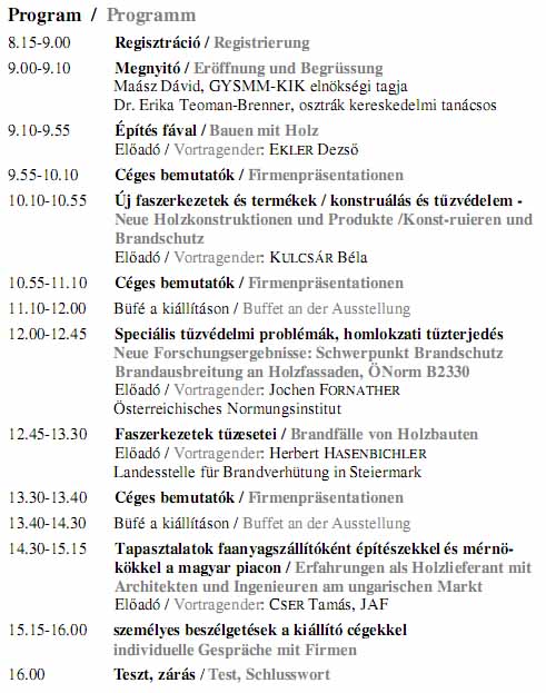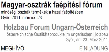 Magyar-osztrák faépítési fórum, 2011.március 23.Az Osztrák Nagykövetség Kereskedelmi Osztálya meghívja az érdeklődőket a faépítési szakmai konferenciára és kiállításra. A konferencia építészeknek, mérnököknek és beruházóknak nyújt lehetőséget arra, hogy átfogó képet kapjanak a faépítési termékekről, szolgáltatásokról, és szakmai tapasztalatokról.
